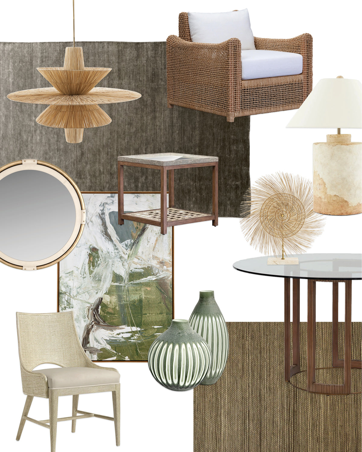 Immerse yourself in a symphony of soft green hues and natural materials, where tranquility and organic beauty converge inharmony. Each piece resonates with the calm of nature’s embrace. From intricately woven abaca and rattan accents to meticulously handcrafted raffia, every detail embodies sustainable craftsmanship and enduring elegance.