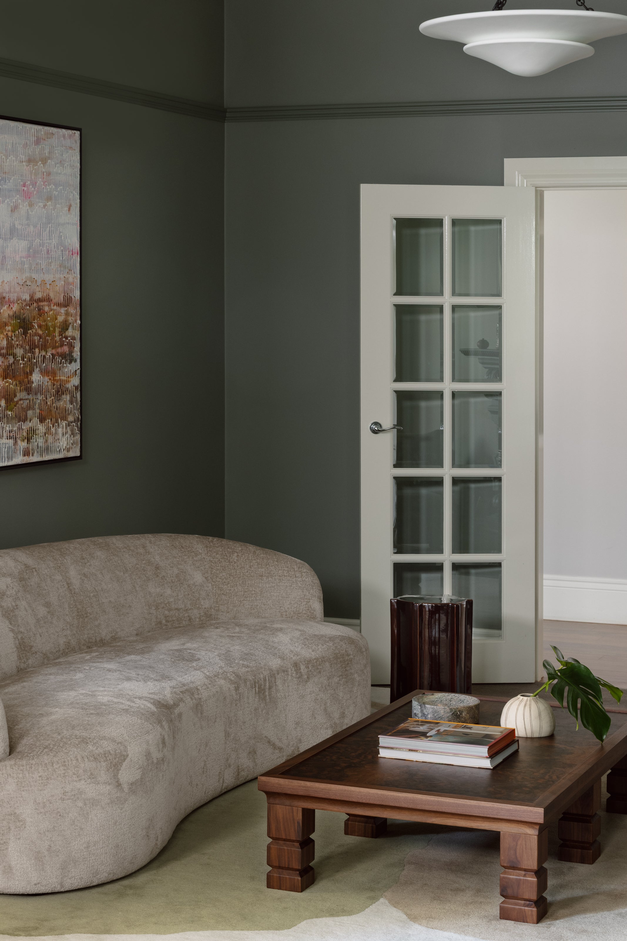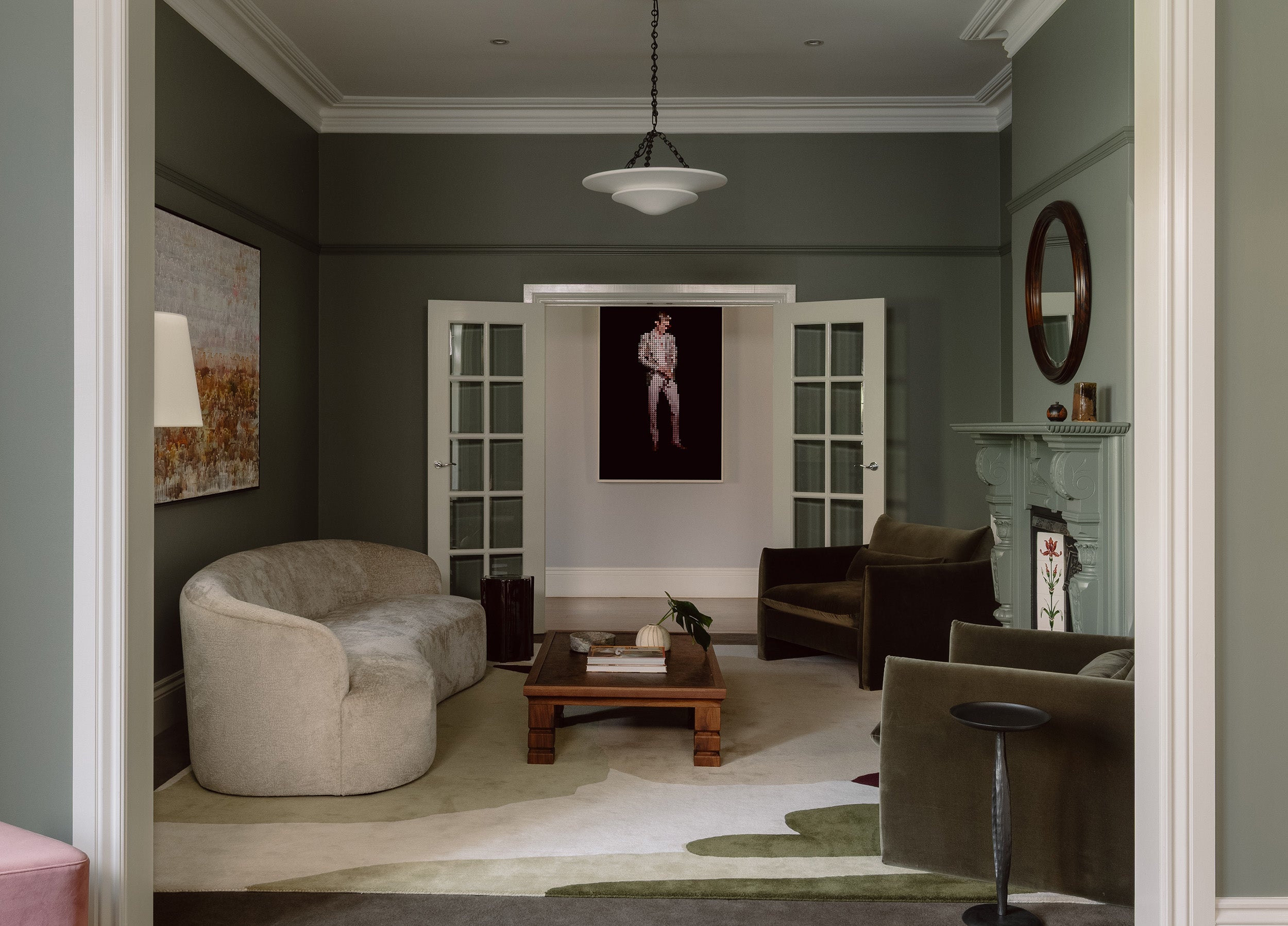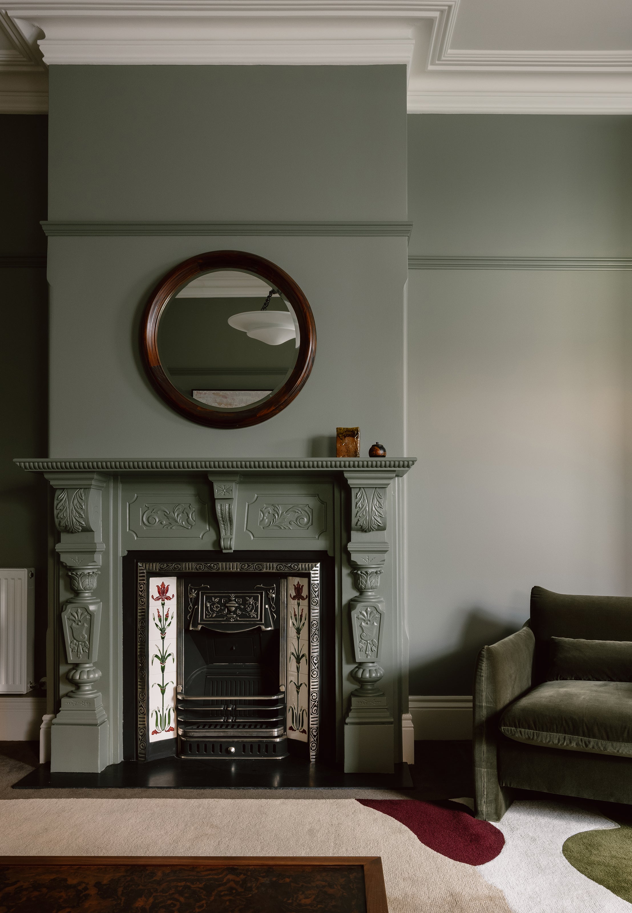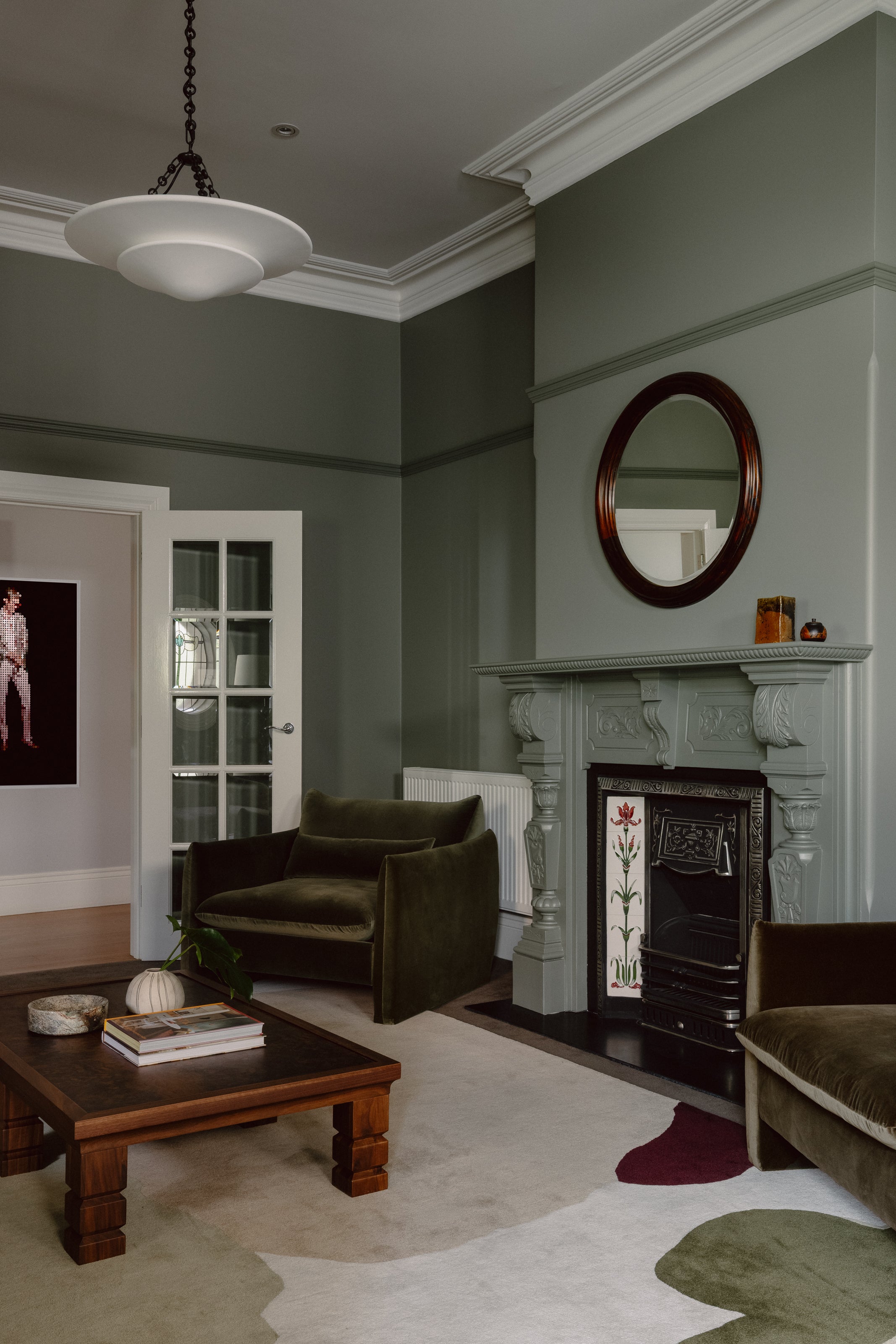 A considered tonal palette deepens atmosphere and draws focus to architectural detailing. Moss green walls heighten intricate carving, wrapping fireplace and panelling in a unified expression so that each element reads as sculptural. Crisp white cornices sharpen proportion, allowing light and shadow to articulate the architecture.