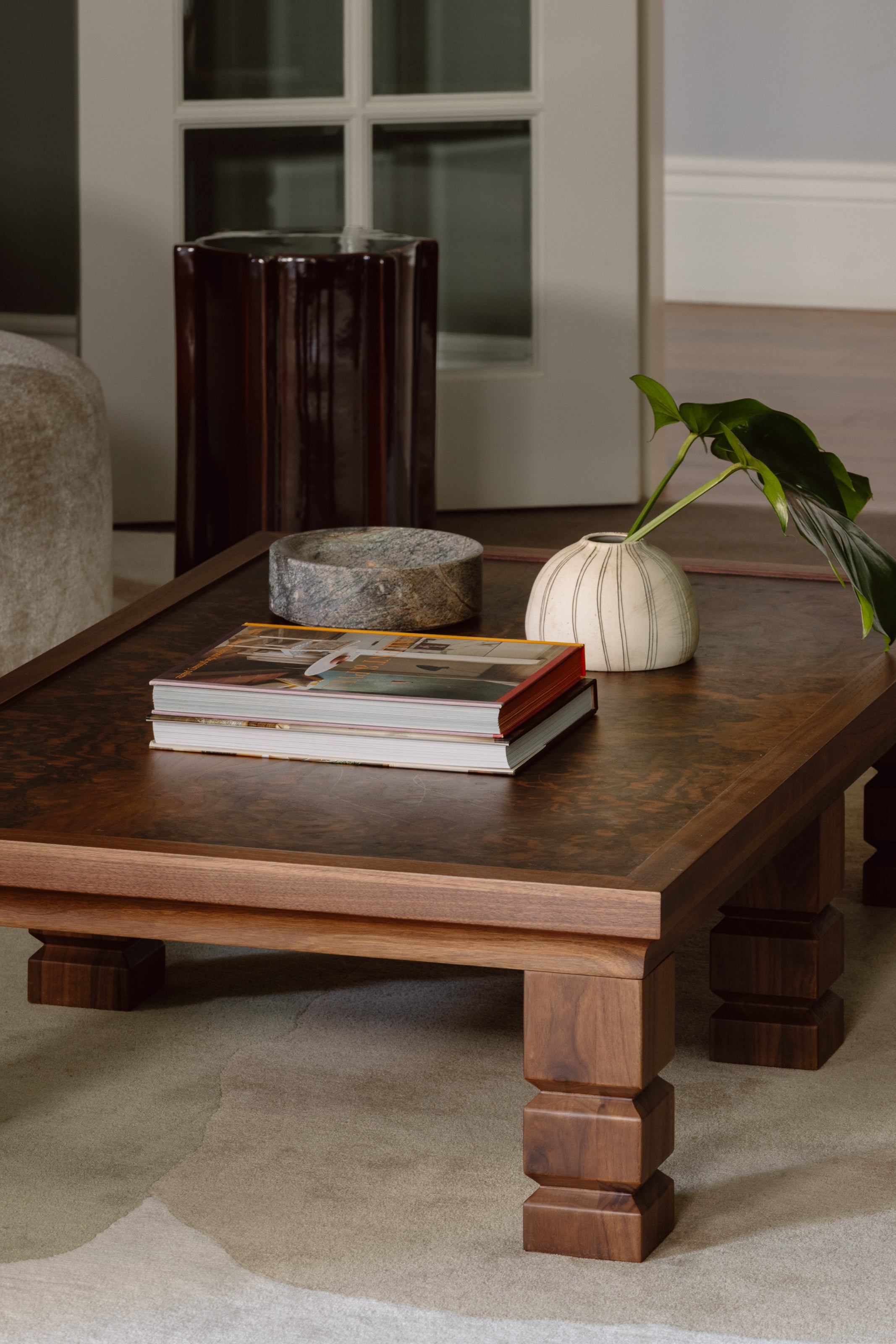 Within the living space, the Hallie Coffee Table carries the home’s richness forward through material and form. Its sculptural kidney-shaped top and arched legs introduce softness against the home’s architectural lines, while the richly textured split bamboo finish captures light and shadow, bringing tactile warmth and anchoring the room with sculptural clarity.
