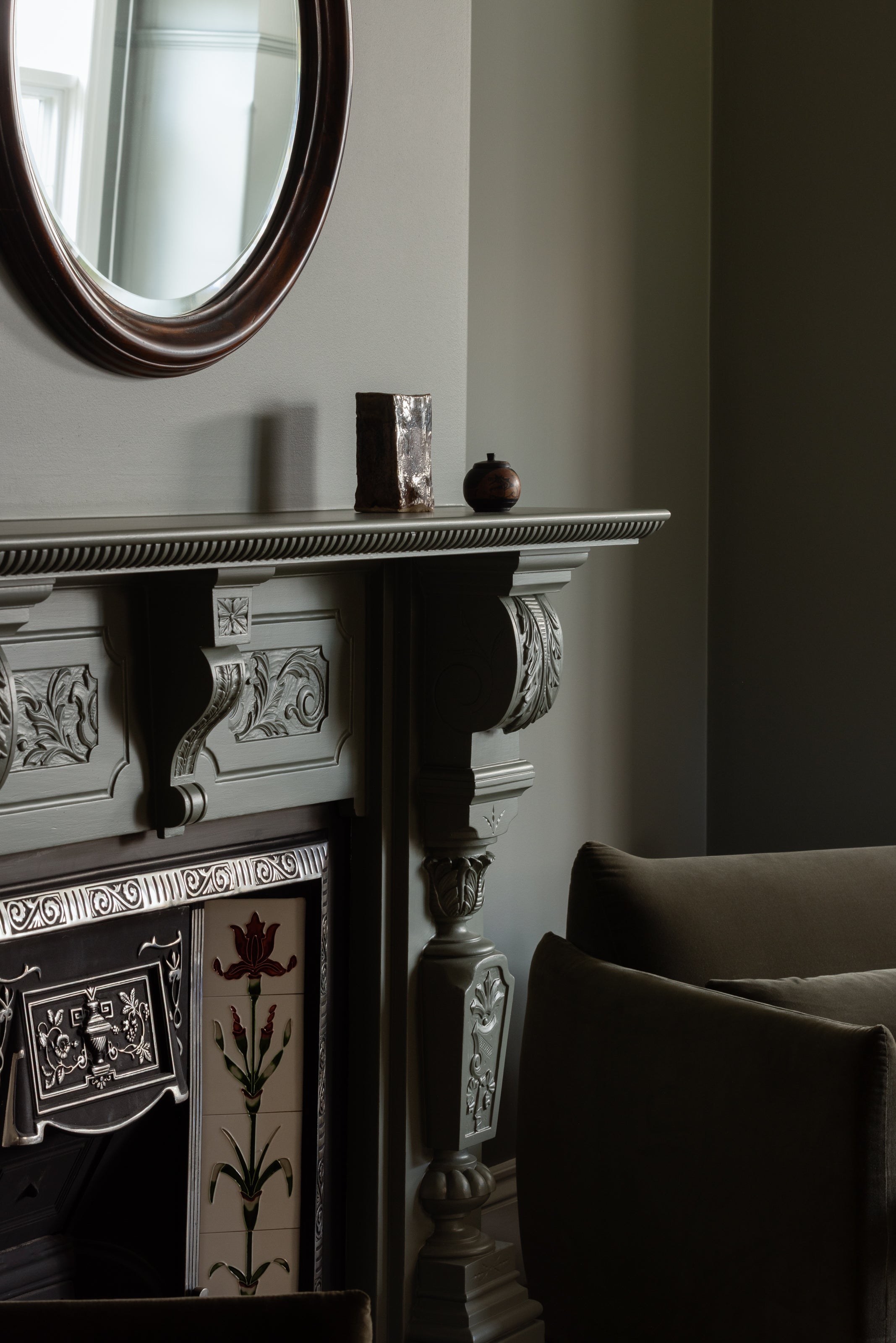 The carved fireplace becomes central within this treatment. Florals, scrolls and moulded brackets are intensified as shadow settles into each recess and light traces the raised forms. Saturated greens absorb light, creating intimacy and weight, while velvet upholstery and dark timbers reinforce the tonal composition with quiet depth.