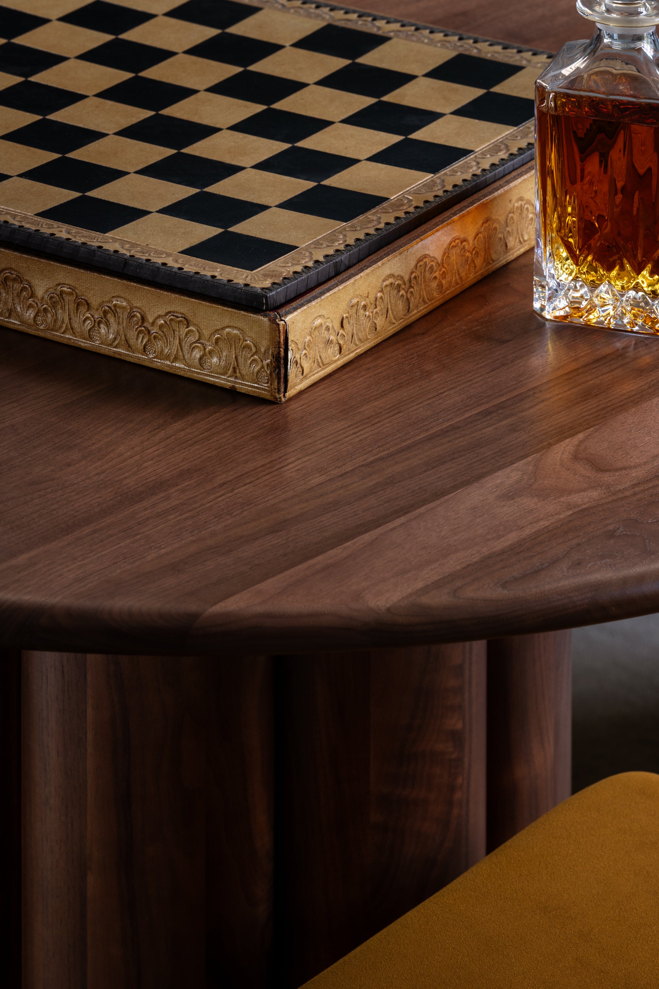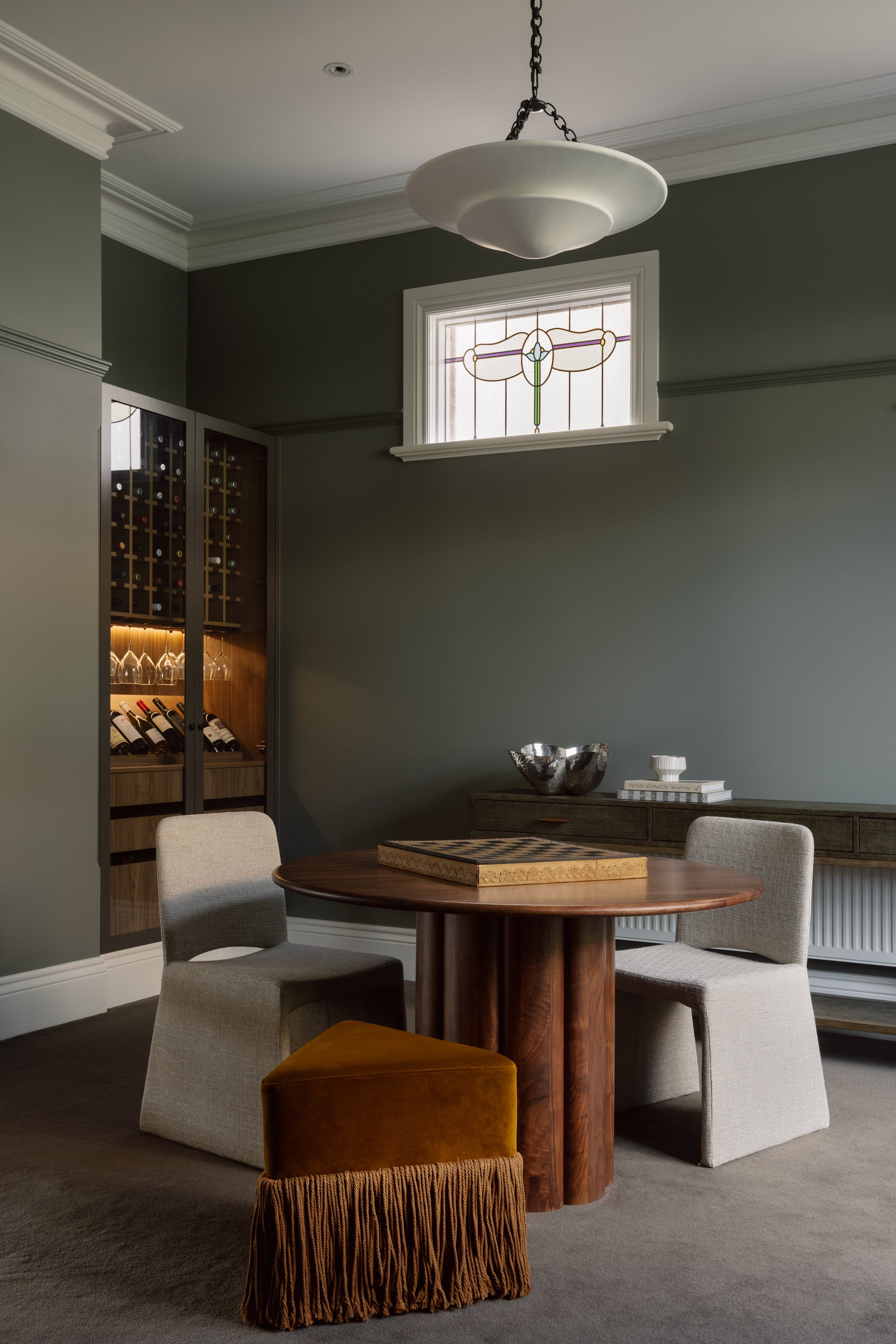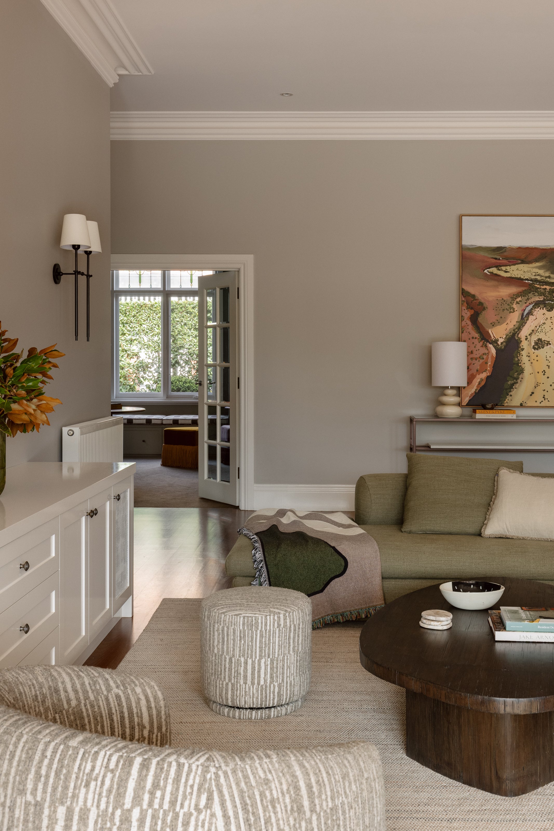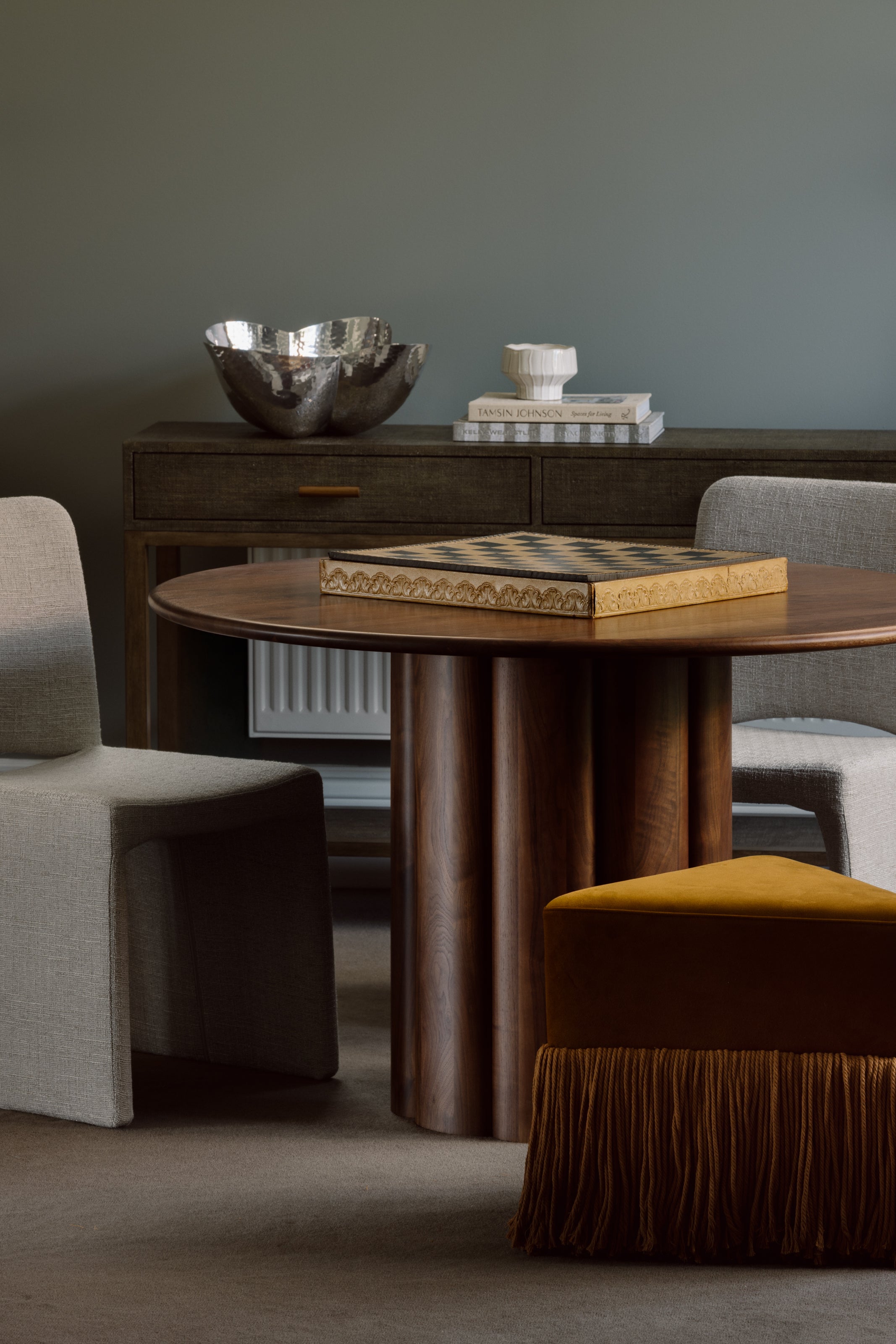 Clifton reinforces the project’s material language. Handcrafted from solid mahogany and paired with slate raffia lamination, its tactile surface introduces depth against the painted walls, while brass hardware adds a restrained note of polish.
