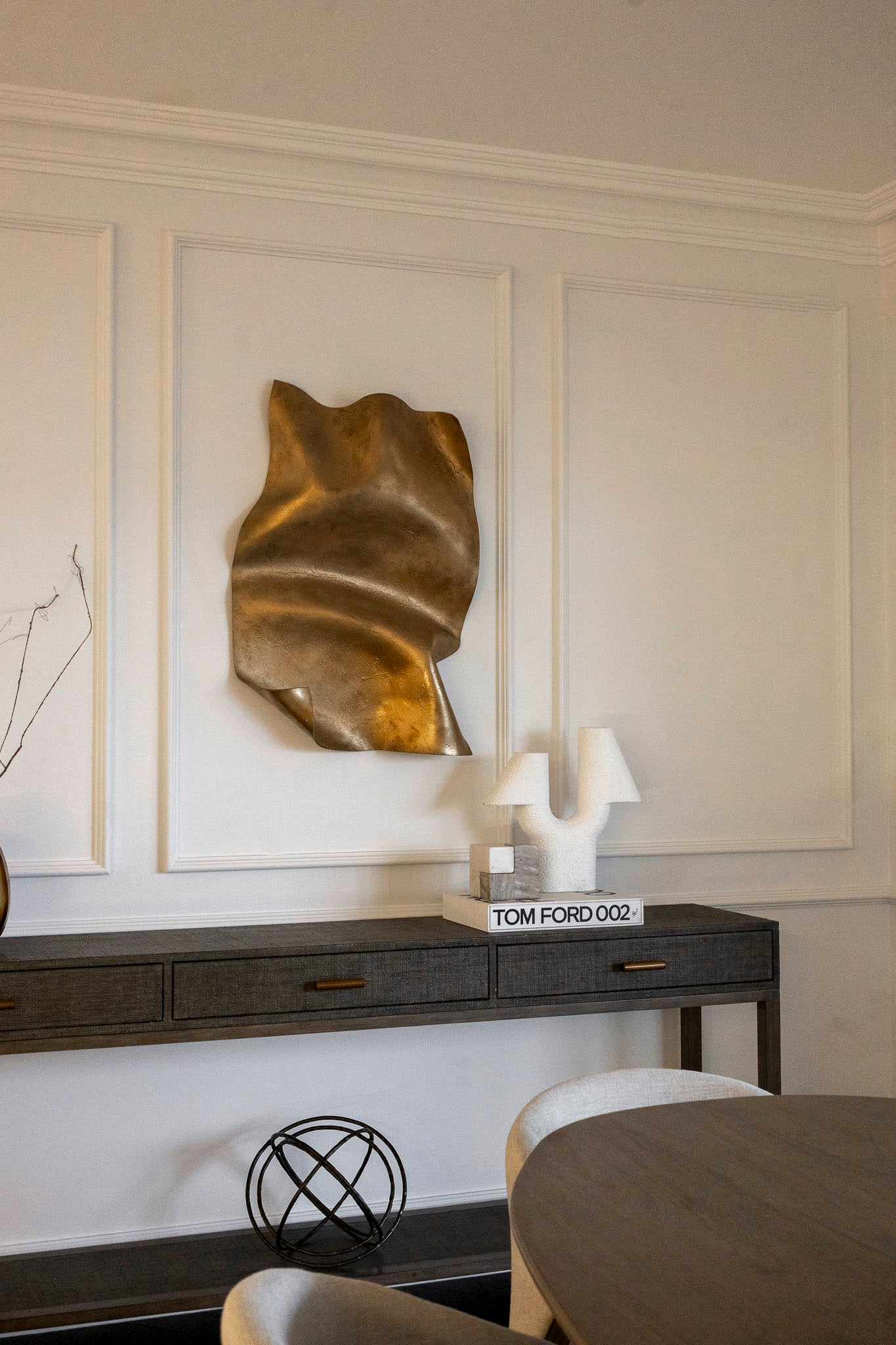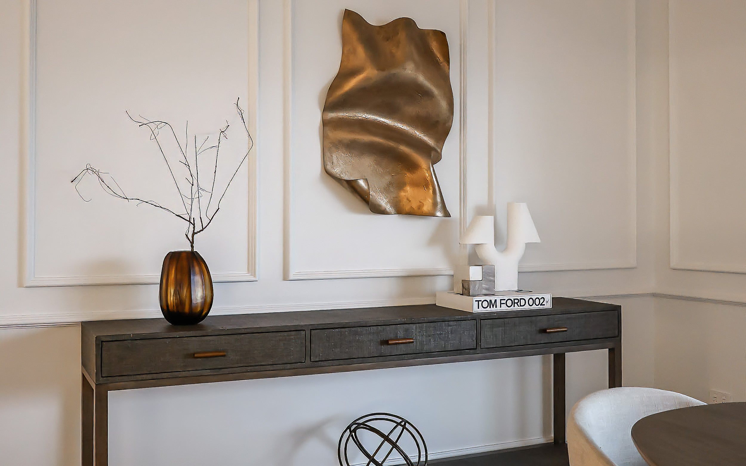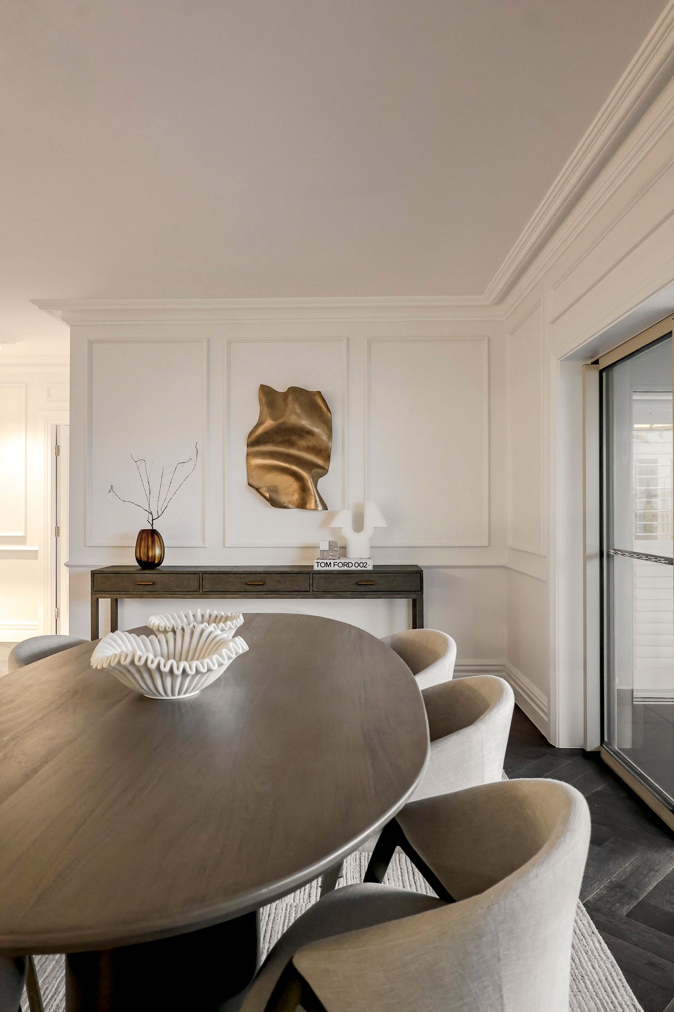 Material contrast plays a defining role across the apartment. Woven raffia surfaces of the Clifton Console sit alongside upholstered seating and refined metal accents, introducing tactility and tonal variation that balance structure with softness. These layered elements allow the furniture to become an integral part of the architectural composition, resulting in an interior that feels resolved and purposeful, elevated yet grounded and defined by clarity of form, material depth and enduring refinement.