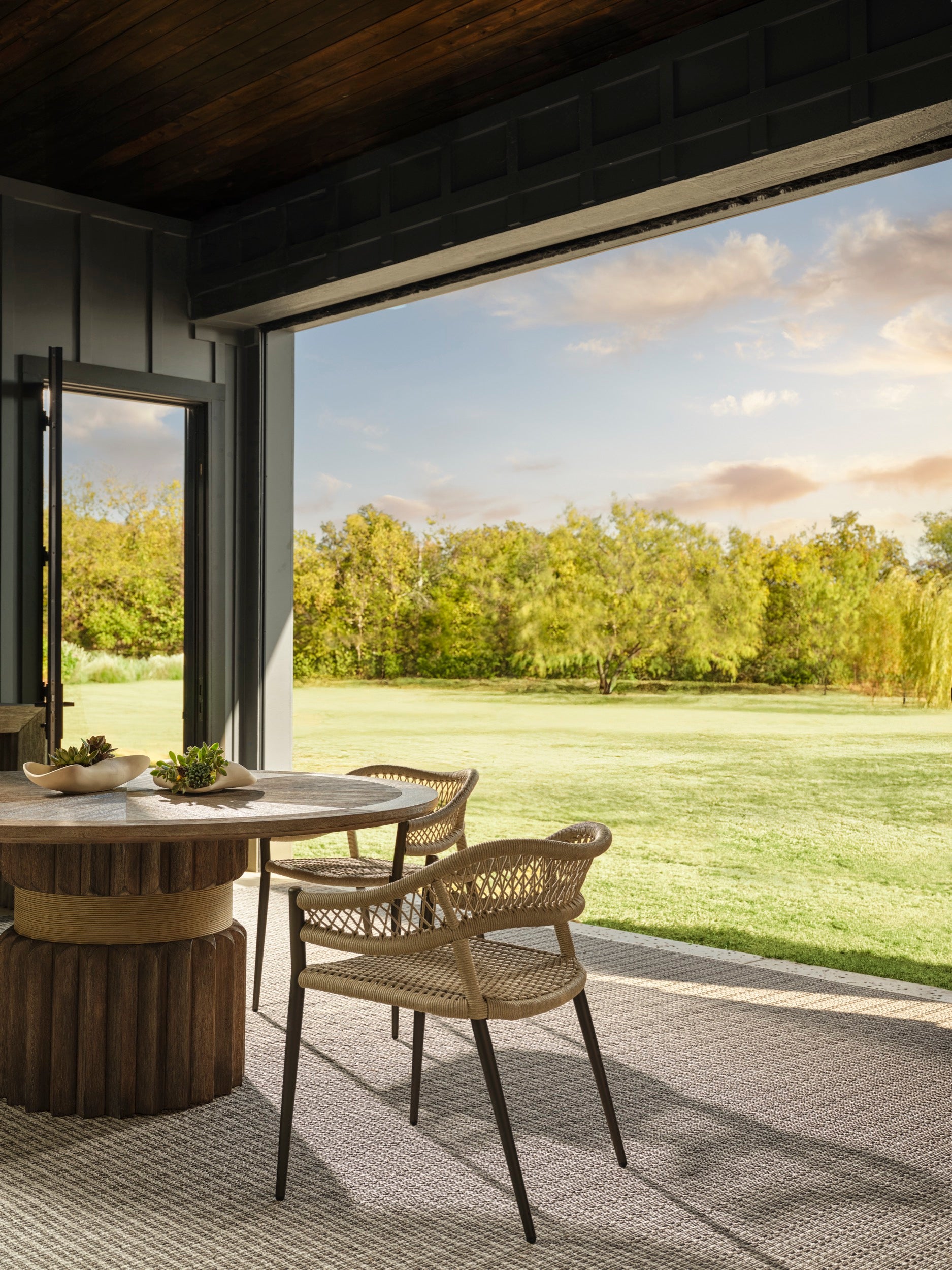 The Aurelie Outdoor Dining Chair showcases a meticulously handwoven pattern in a synthetic rope. Its continuous-looped craftsmanship, results in a fluid, tactile weave that feels both modern and timeless. A chic, fashion-inflected addition to outdoor dining, it elevates the space with understated elegance.