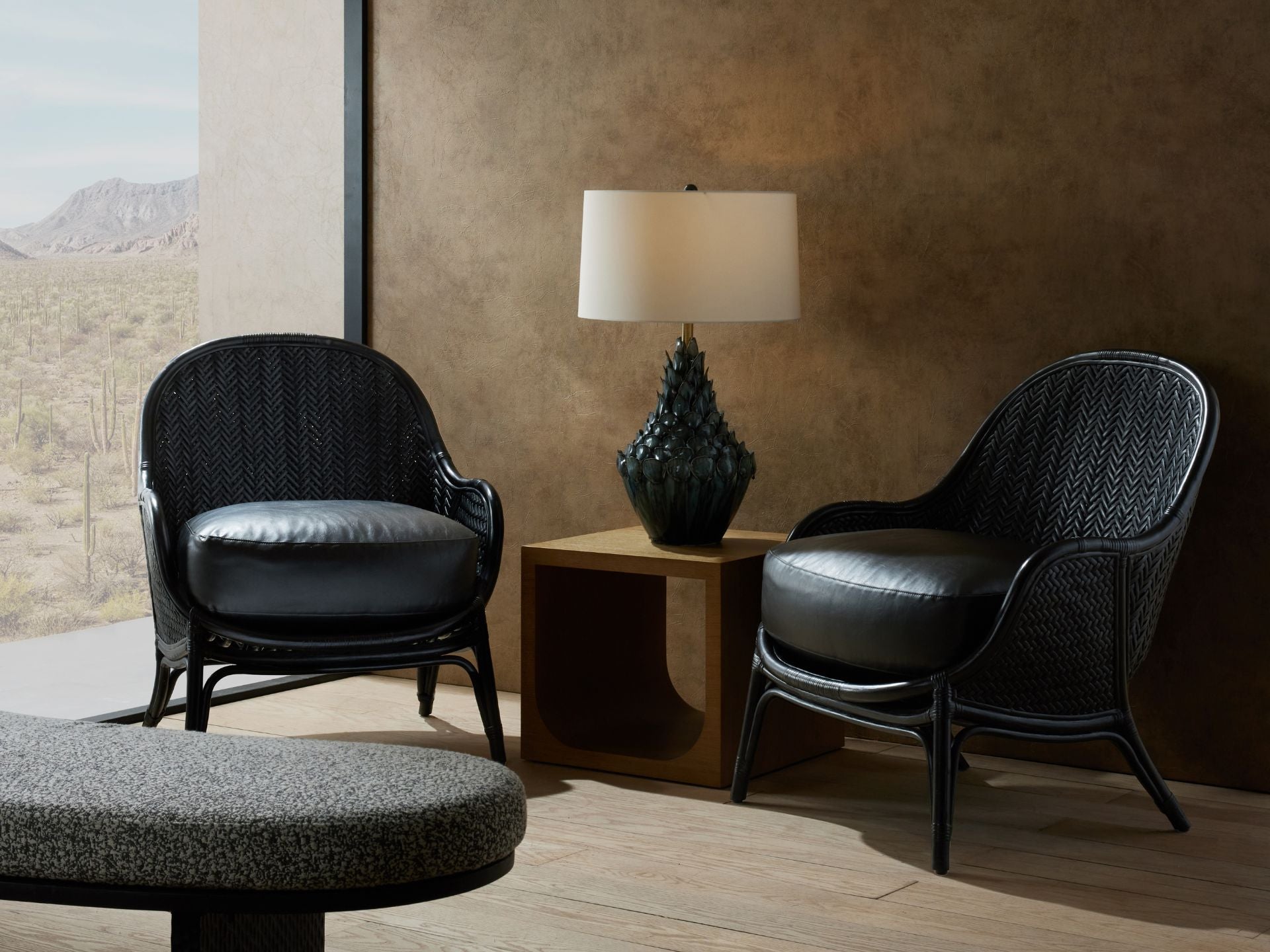 Sophisticated black rattan updates a traditional wicker lounge. Designed with rounded armrests and an egg-shaped back to encircle the body. Woven in a fine herringbone pattern and layered with a vegan leather seat in noir. Rattan and leather will vary