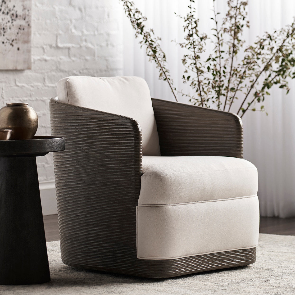 Hardwood frame with core rattan horizontally placed and wrapped around a thin sleek double wall back and sides featuring a 360 degree swivel mechanism. Chair comes with a fixed uph upholstered seat and loose back cushion. Available in all PALECEK finishes.