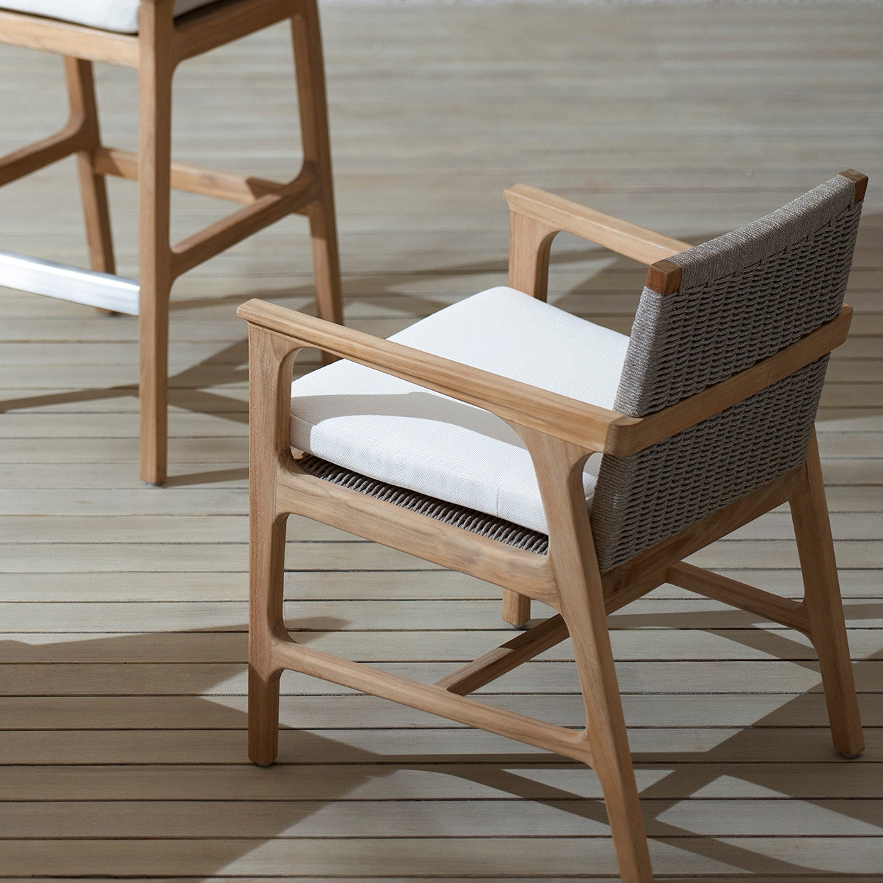 Teak wood frame, legs and arms in a natural golden brown finish, features a double wall back and seat in a grey all-weather synthetic rope with maximum UV protection. Chair comes with a loose seat cushion. Natural teak wood is a golden brown color and over time, with exposure to the elements, will gradually change to a silver gray patina which distinguishes finely aged outdoor teak. Coordinates with the Delmar outdoor collection.