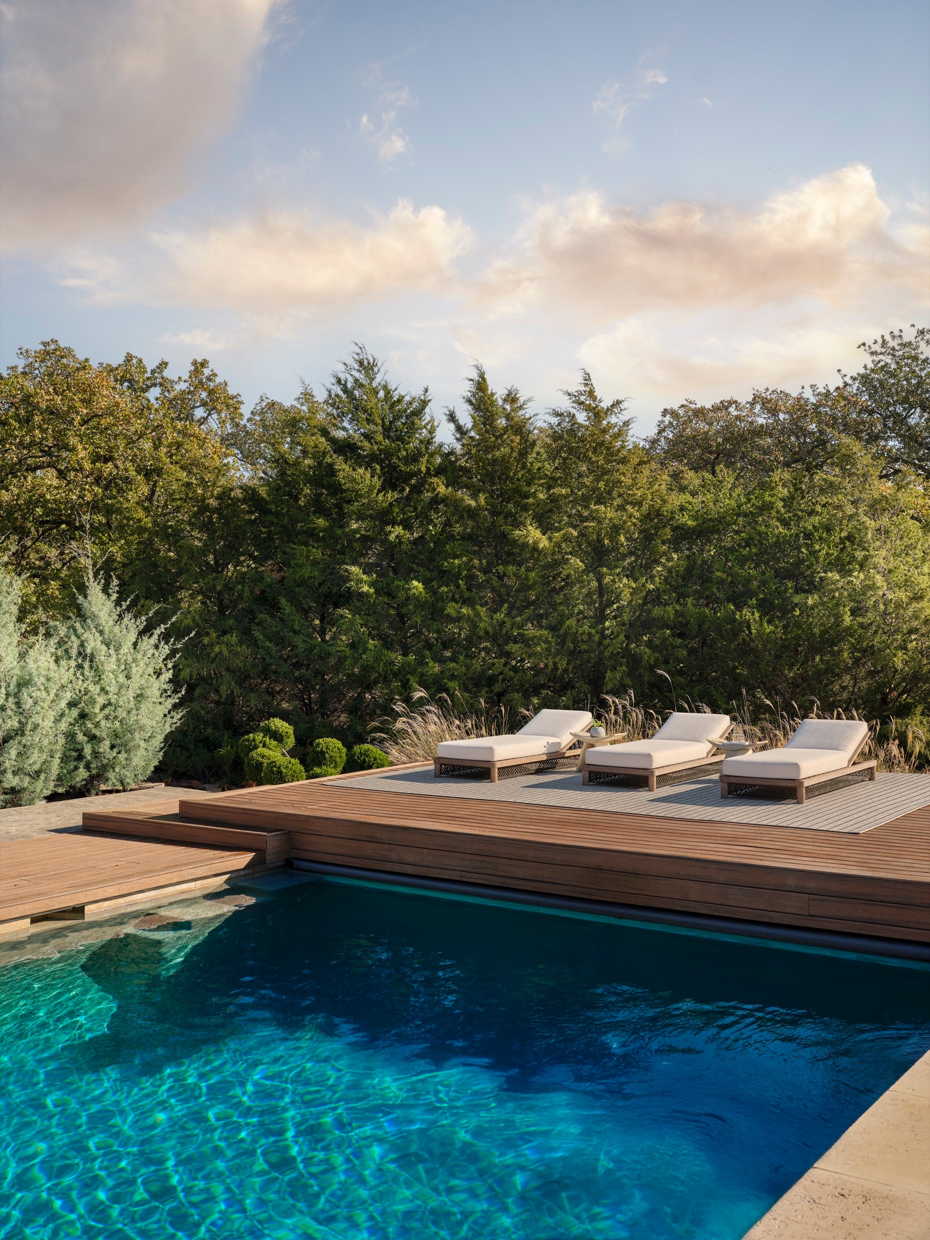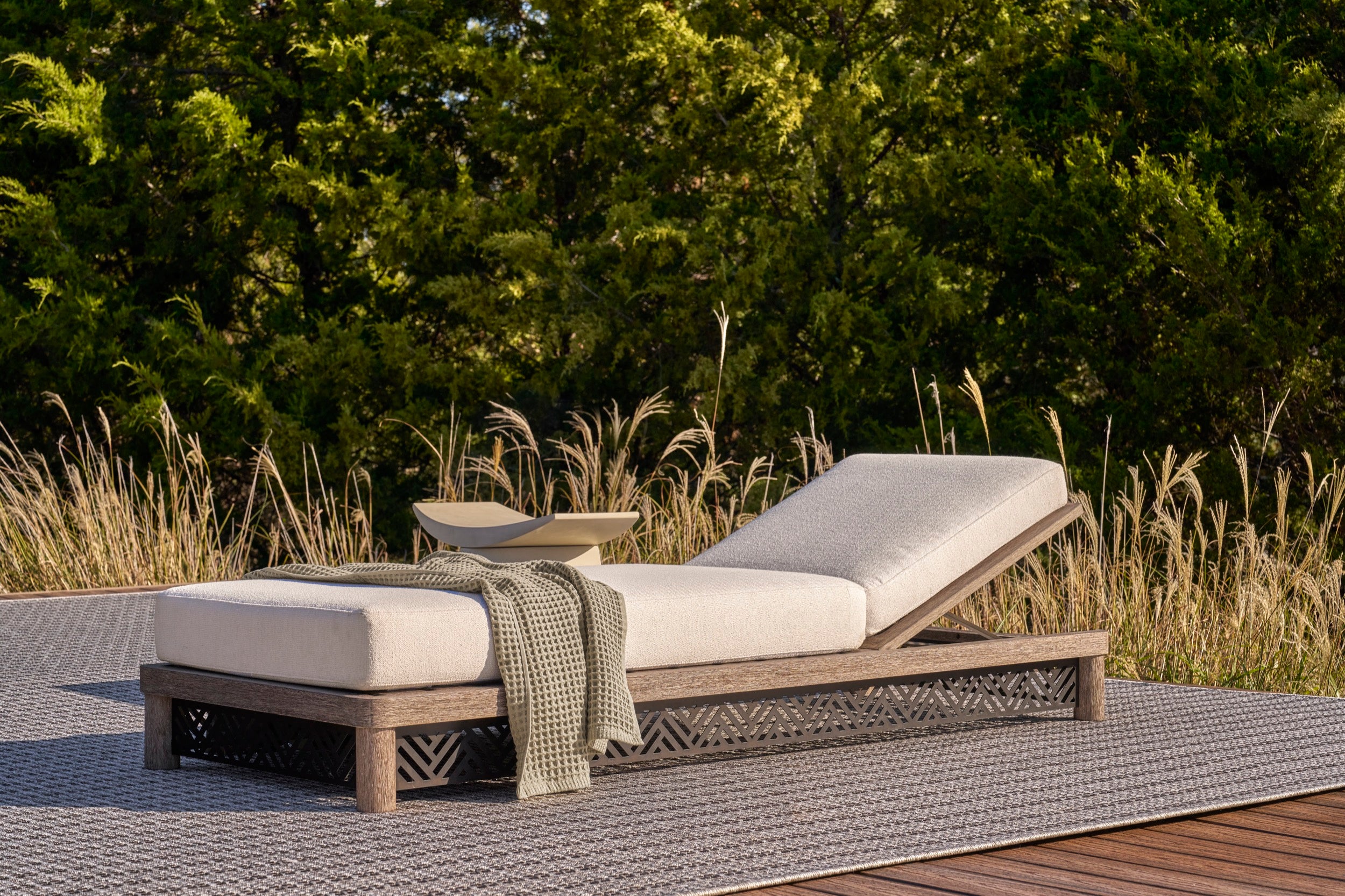 The Emoto Outdoor Chaise elevates poolside lounging with its refined profile and an outdoor performance bouclé upholstery. A precisely laser-cut chevron pattern adds an artful textural detail to the frame, enhancing its sculptural appeal. Arranged in multiples, the chaise creates a cohesive and sophisticated relaxation area.