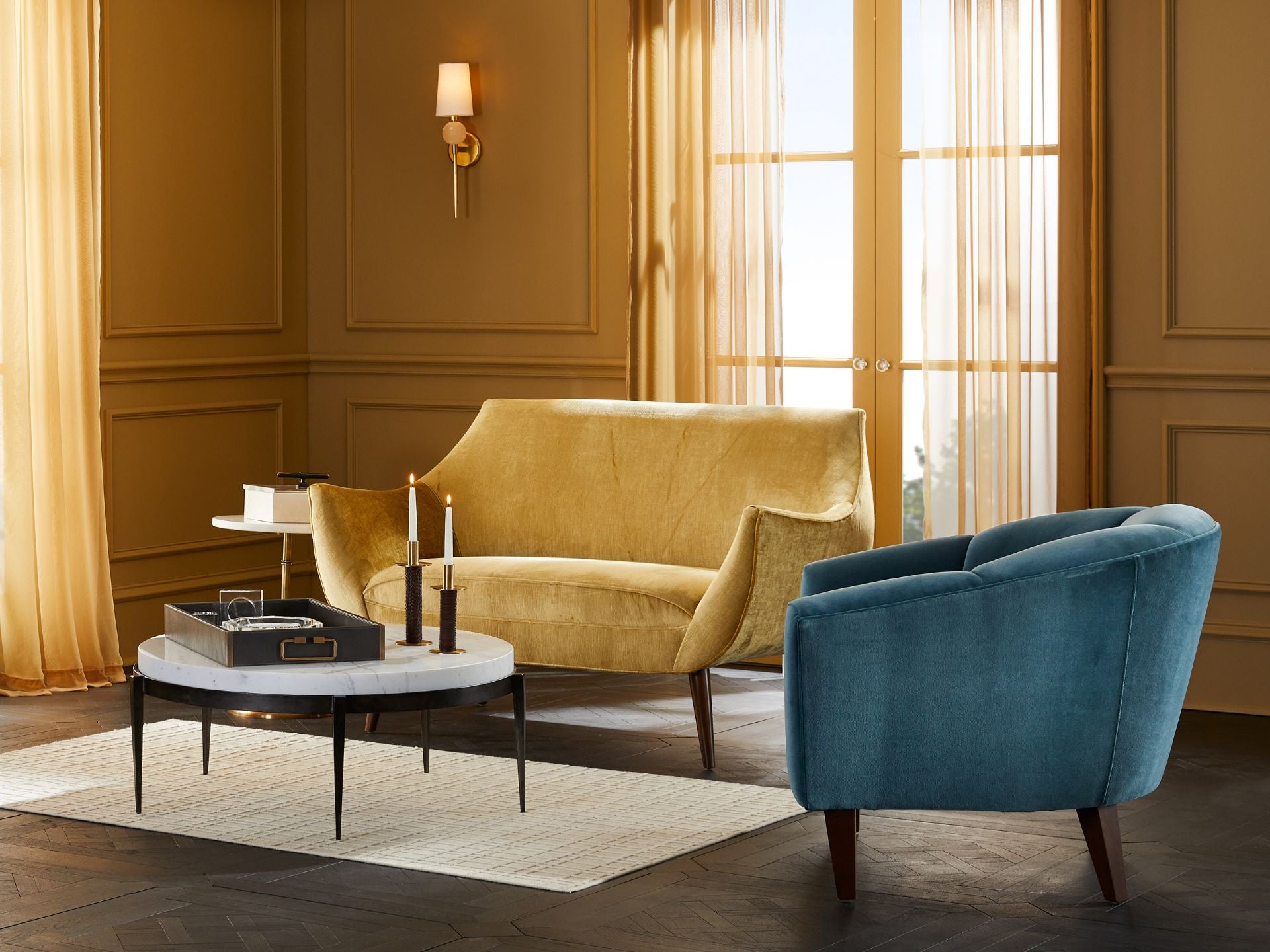 Inspired by mid-century modern design, this settee provides a curvaceous design with its swooping arms and mid-rise back. Covered in marigold velvet, a tight seat and back combine with an extended U-shaped profile. Tapered wood legs finished in dark walnut are angled outward to complete the look. Fabric and finish will vary.