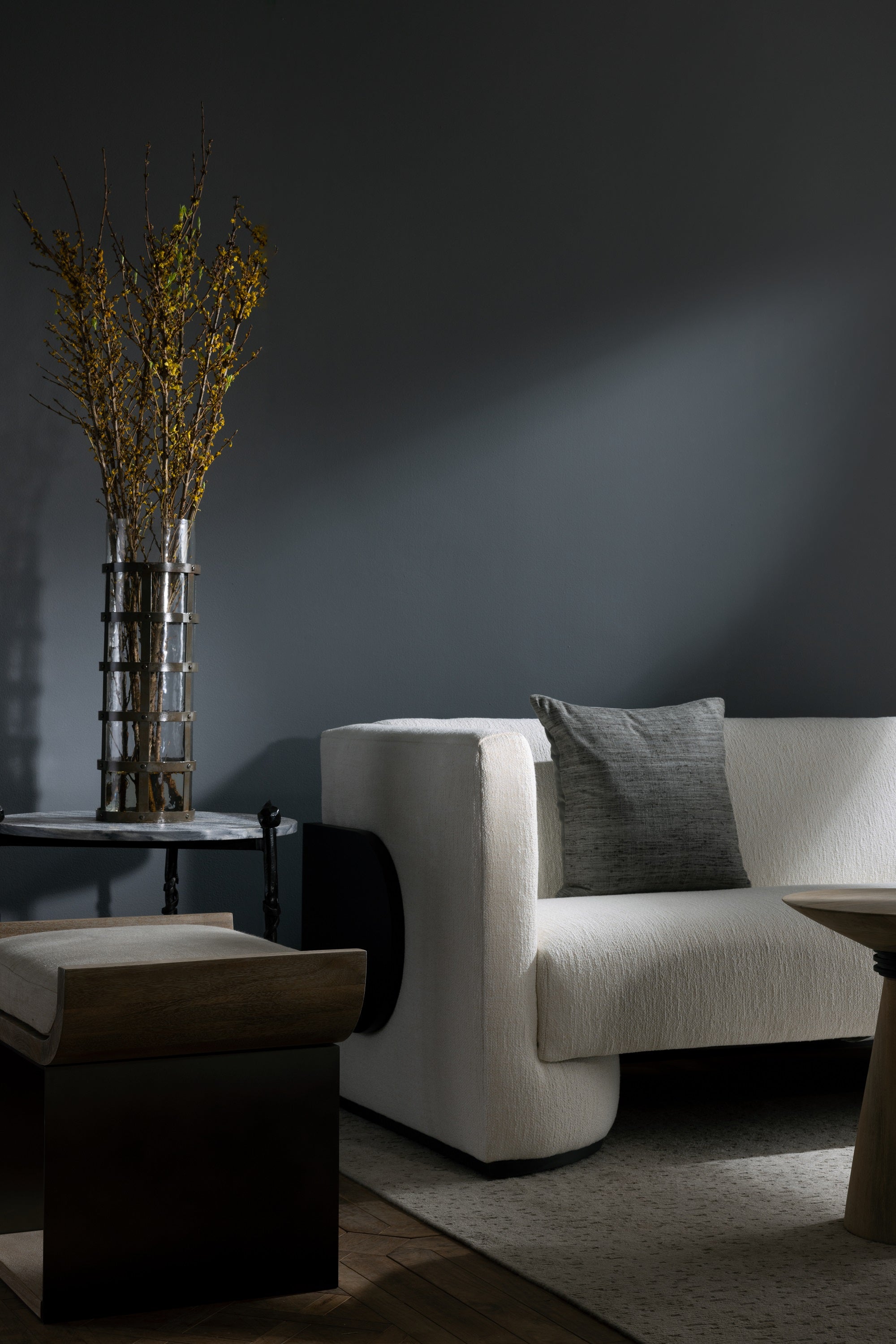 The unique design of this modern settee provides a flair of the neo-Memphis design movement. Upholstered in cloud boucle, the grey-ash wood panel wrapped detail adds a dramatic accent, the rounded arm panel softening the angular silhouette. A straight-line profile and tailered cushioning elevates the look of this piece. Fabric and finish will vary.